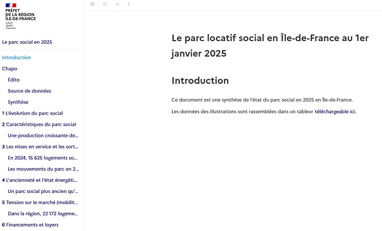 La Drihl publie, en coordination avec toutes les autres Dreal et DEAL, le jour même de la publication des résultats nationaux, les données sur le logement locatif social francilien au 1er janvier 2025. Les données actualisées du parc sont présentées en 6 chapitres : évolution du parc, principales caractéristiques, mises en services et sorties de parc, ancienneté et état énergétique du bâti, tension du marché et loyers et financement.